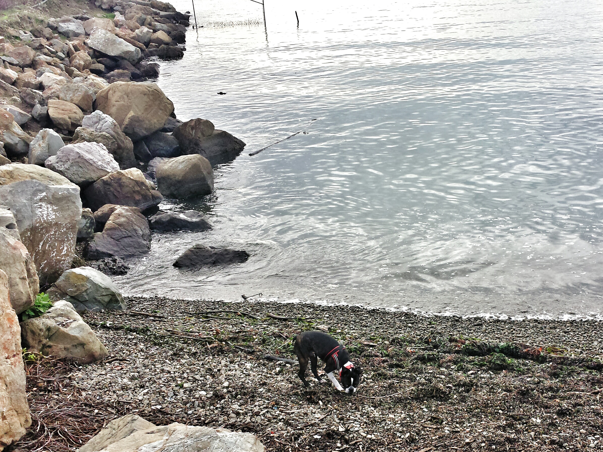 I usually like to begin at the Costco end, and take The Bay Trail to one of the benches set up for scenic views, and sit and play there for a bit. Sometimes I might get a coffee from the Sit and Stay Cafe first, and enjoy it while watching the birds or gazing at the bridges. There are rocks along this part that Chico and I like to Explore instead of staying on the paved path.