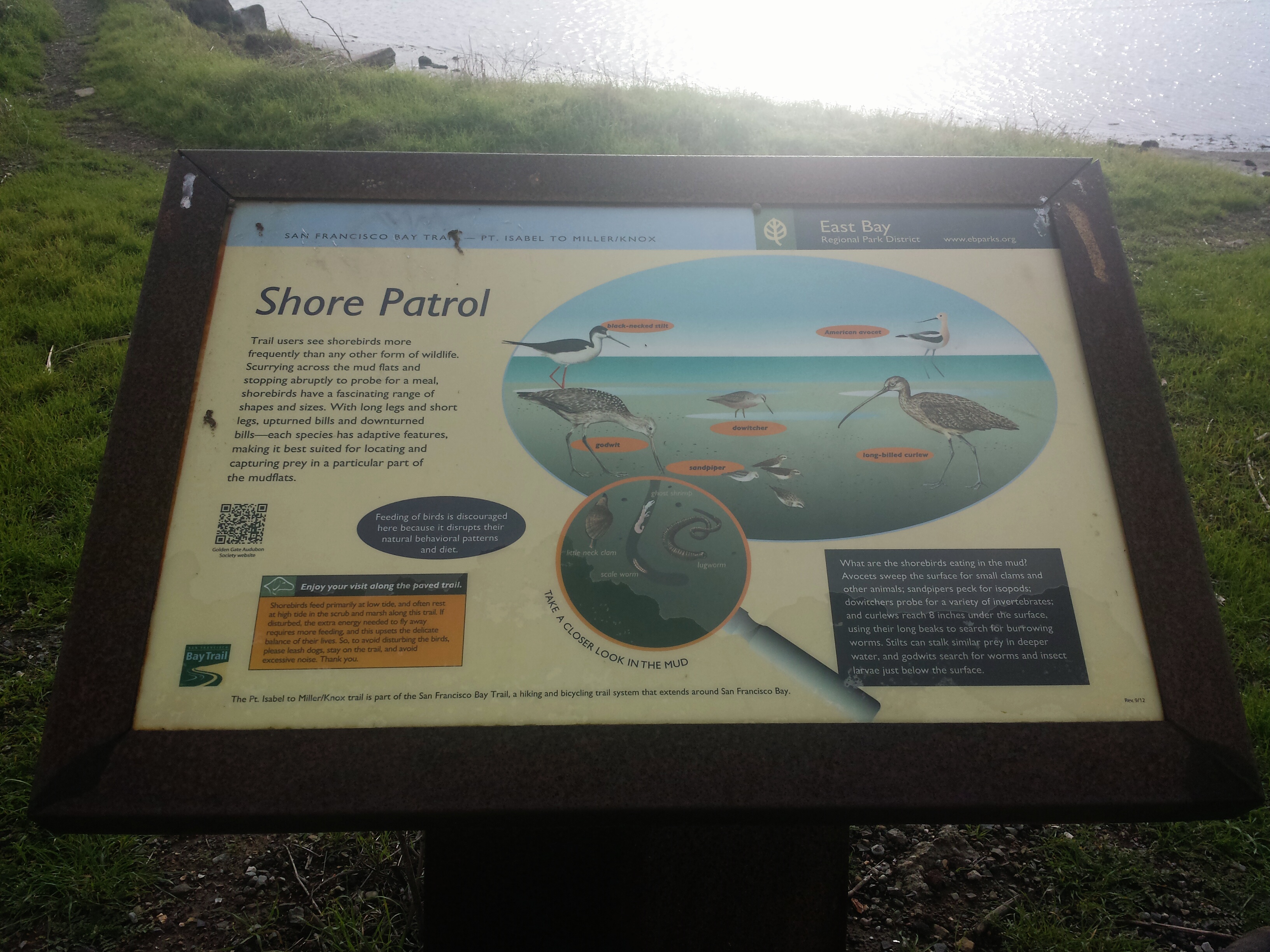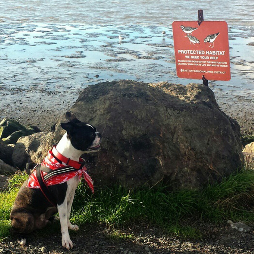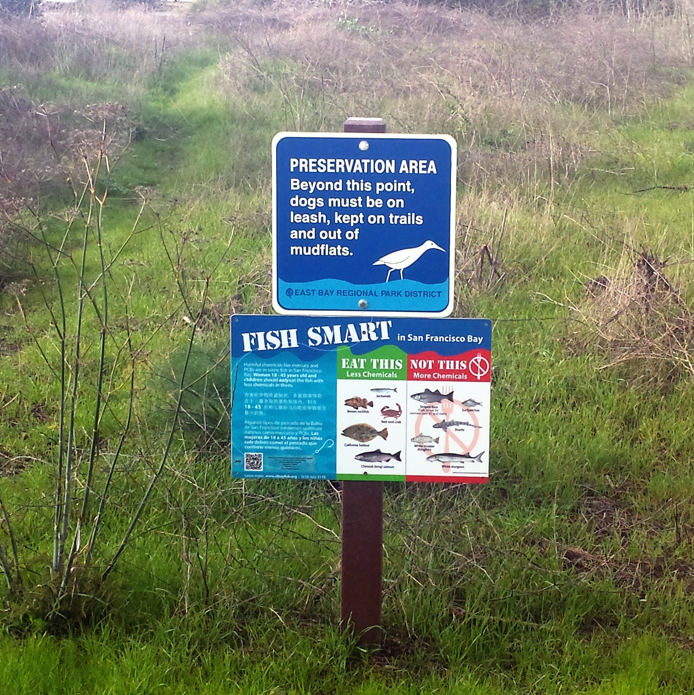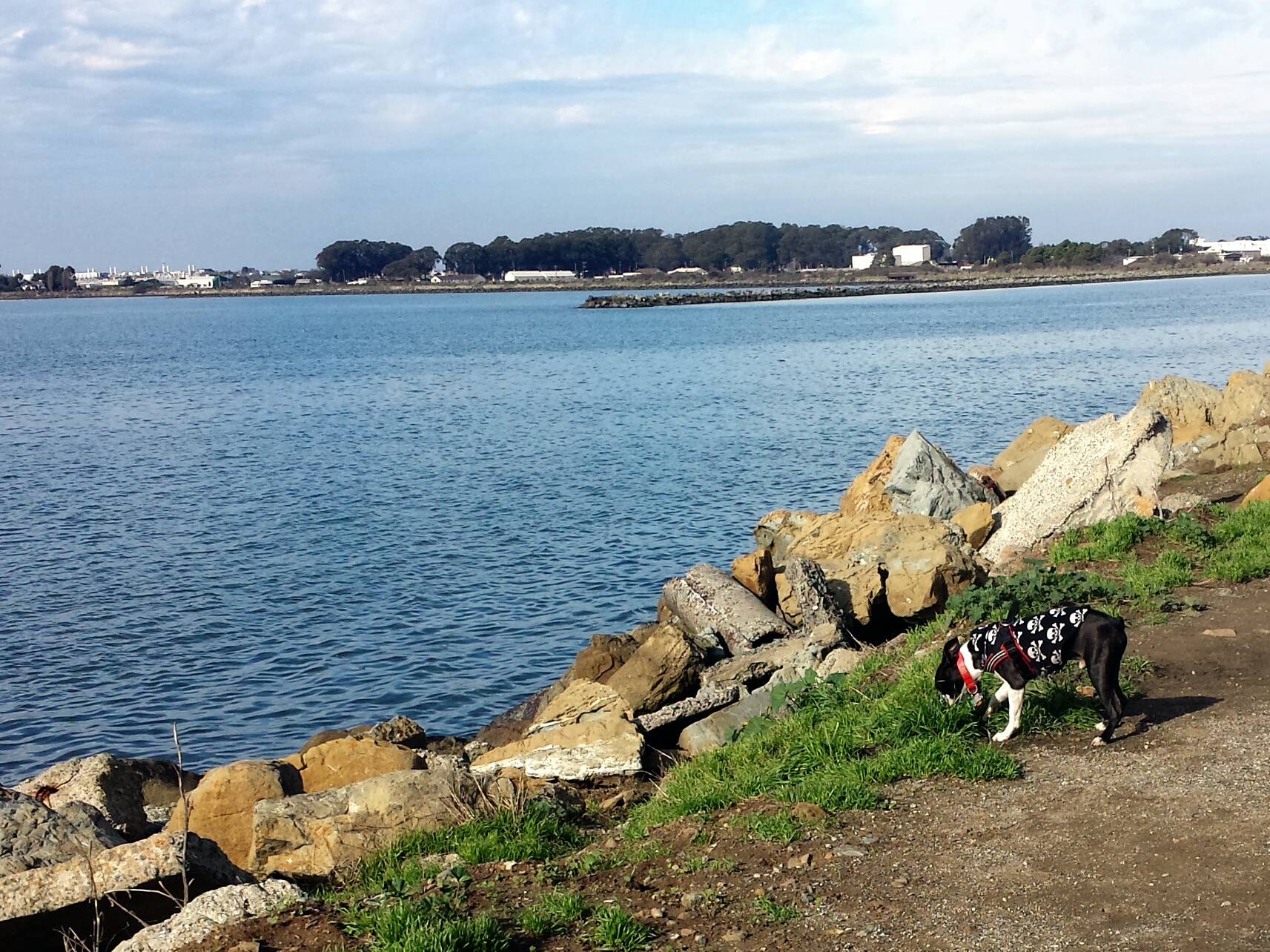 I brought Chico here to work on how super enthusiastic and excited he got when ever he saw another dog on the trail, and still work on this from time to time since he is still really young, and I also practice not having that super excited feeling of will he or won’t he. Because there are also dirt trails here, that resemble most hiking trails, we practice staying on the trail while off leash, as well as practice recall in a high distraction area. My favorite thing to practice tho, just might be his outdoor cafe manners, as we hang out at the Sit and Stay Cafe patio–they have tasty food including some good vegetarian options, or you can bring your own. There is the main paved path that wraps around the main part of the park, or there are less populated dirt paths, that you can take to the bridge to the park’s peninsula, On the Peninsula all the paths are dirt, and there is a big green plateau to play on. I usually take the path that runs straight from the bridge, to The Bay Trail, which has many informative signs about the history of the area and wildlife.