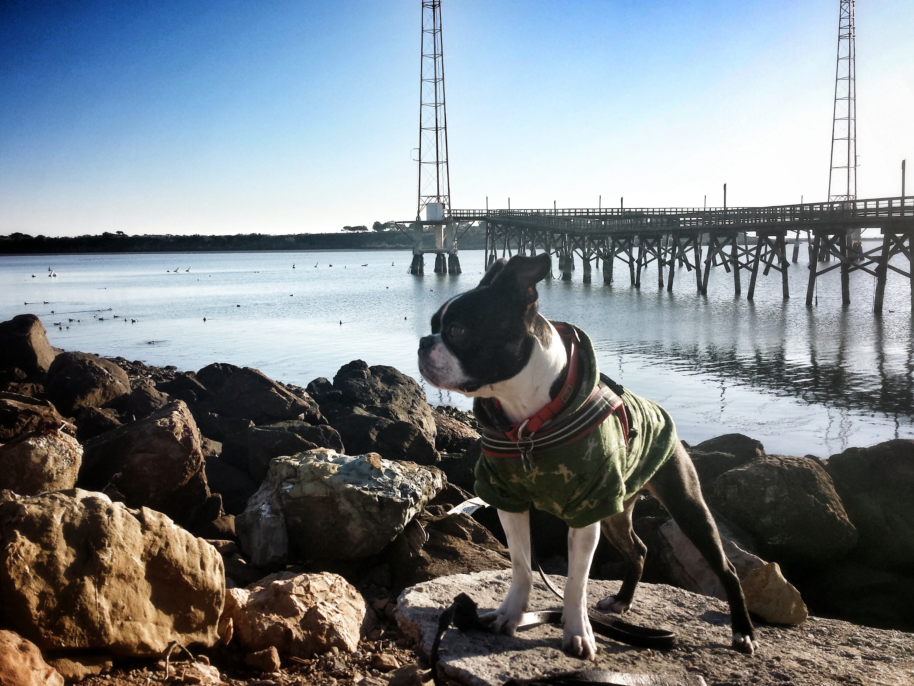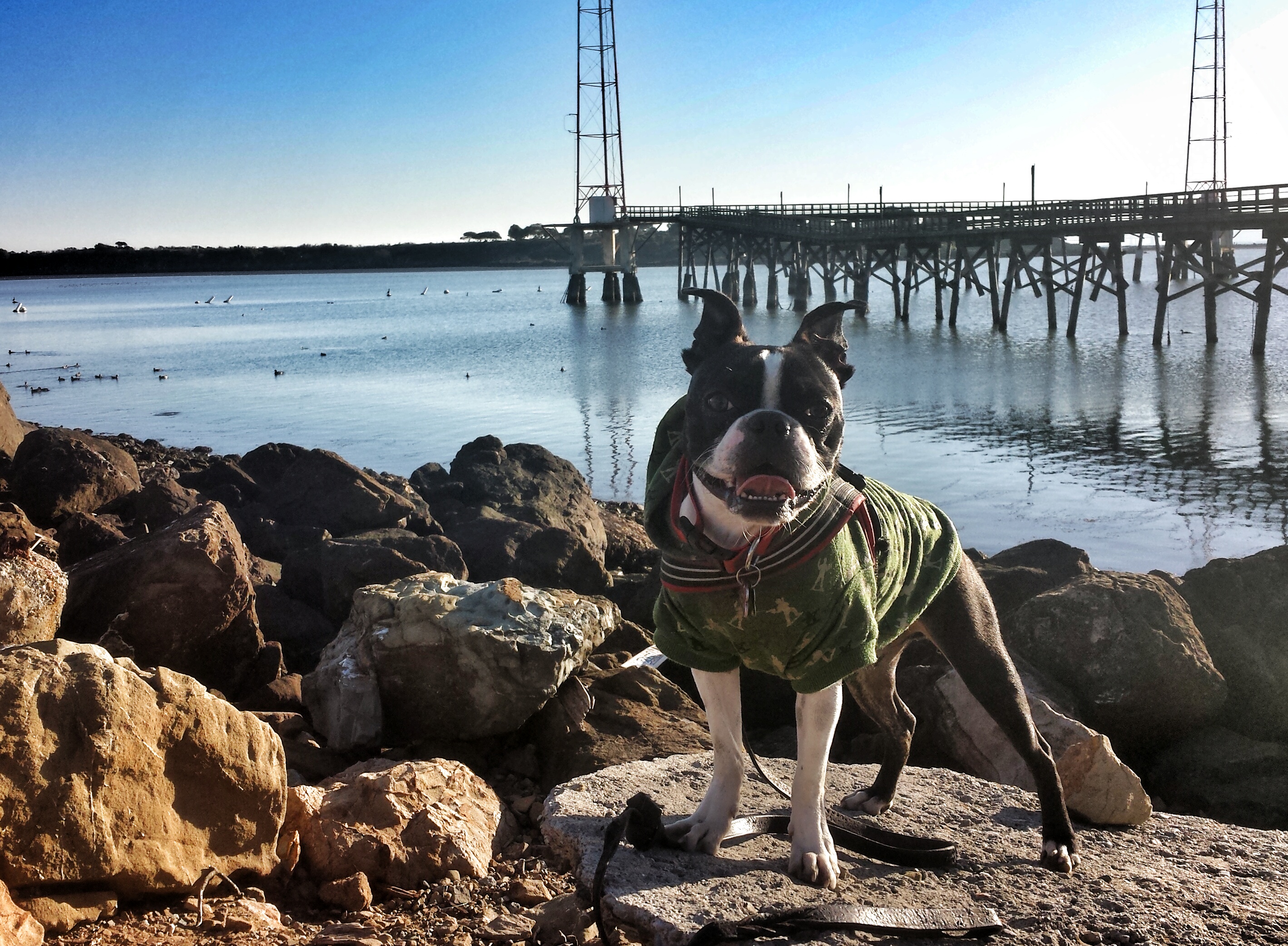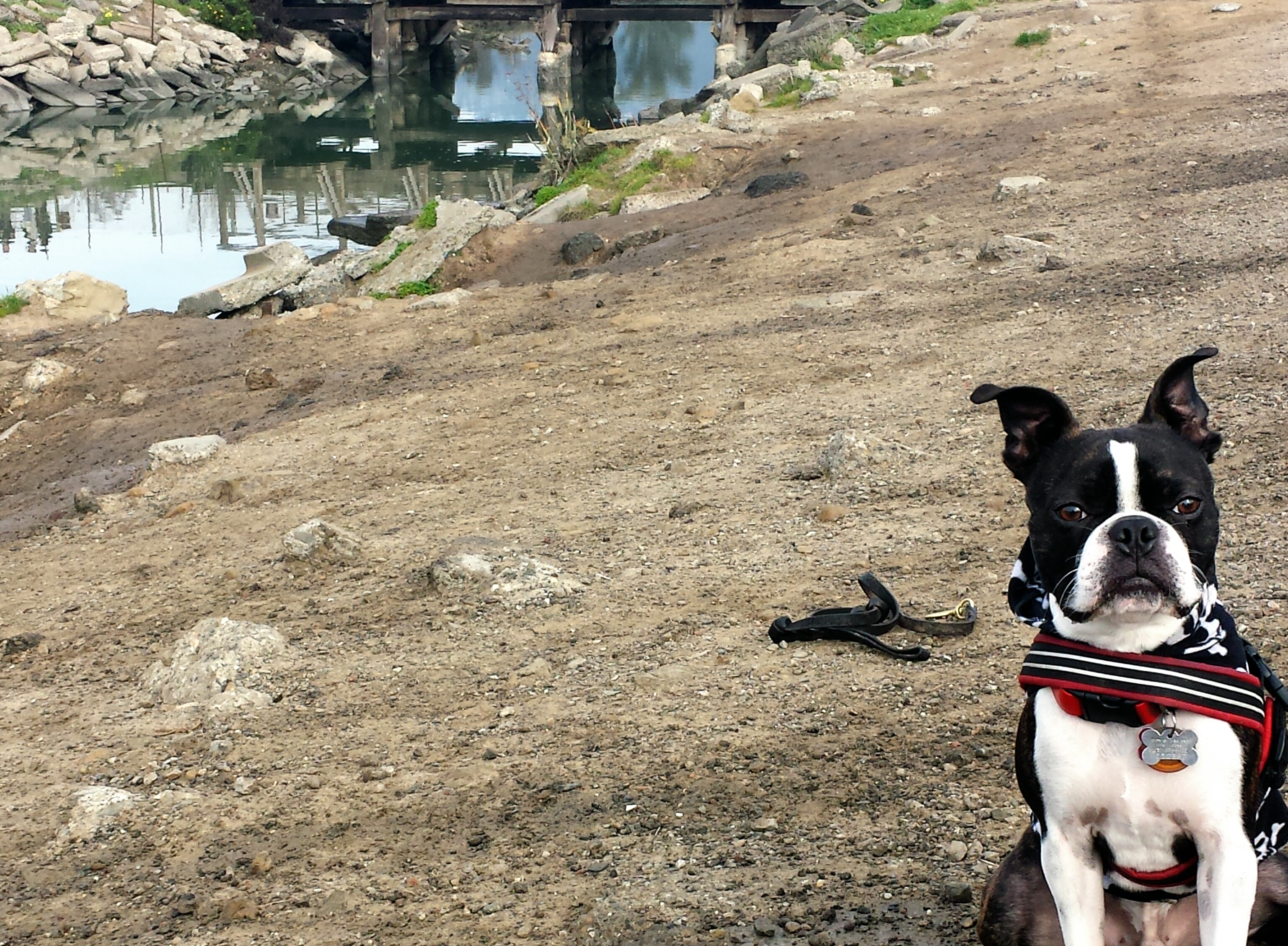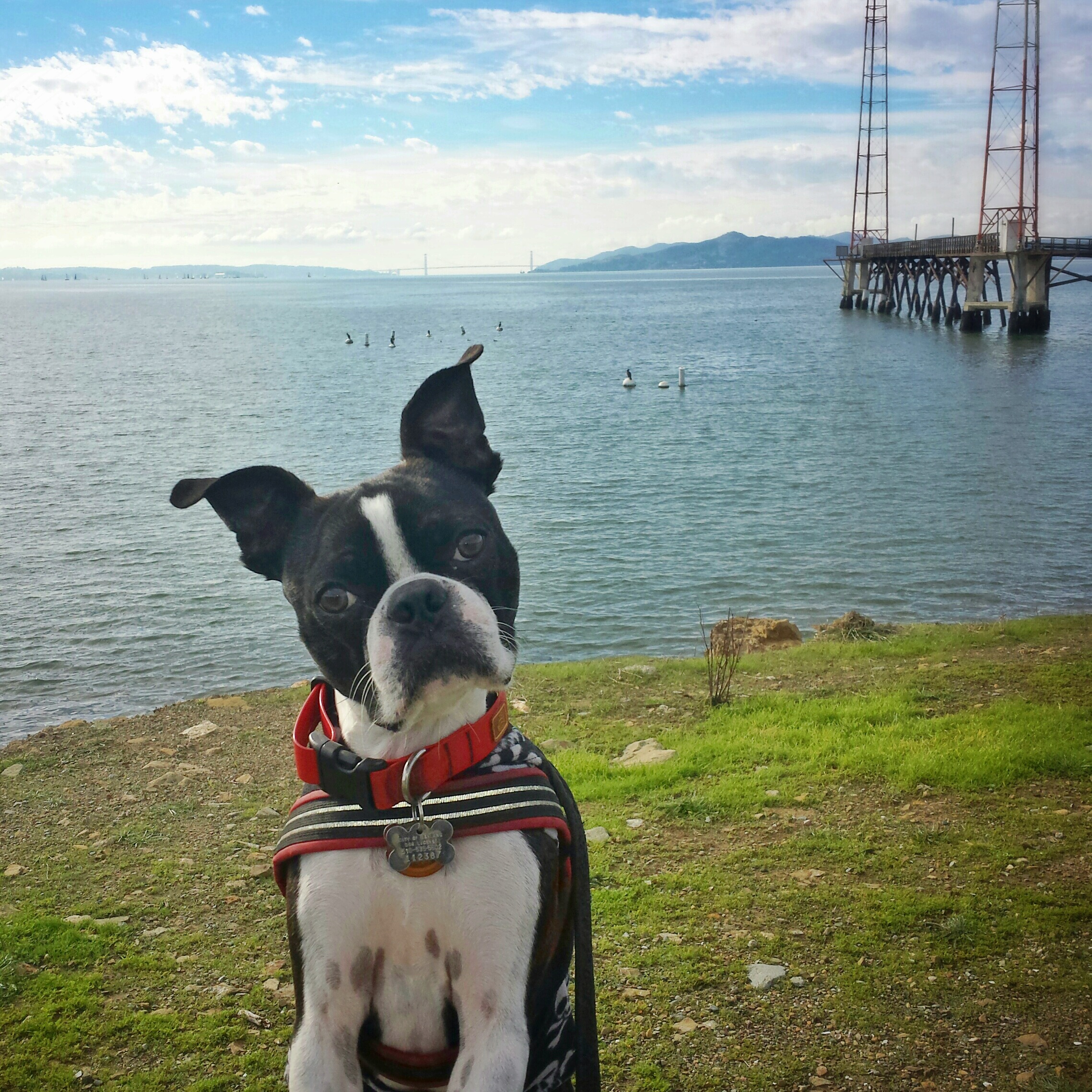 I brought Chico here to work on how super enthusiastic and excited he got when ever he saw another dog on the trail, and still work on this from time to time since he is still really young, and I also practice not having that super excited feeling of will he or won’t he. Because there are also dirt trails here, that resemble most hiking trails, we practice staying on the trail while off leash, as well as practice recall in a high distraction area. My favorite thing to practice tho, just might be his outdoor cafe manners, as we hang out at the Sit and Stay Cafe patio–they have tasty food including some good vegetarian options, or you can bring your own. There is the main paved path that wraps around the main part of the park, or there are less populated dirt paths, that you can take to the bridge to the park’s peninsula, On the Peninsula all the paths are dirt, and there is a big green plateau to play on. I usually take the path that runs straight from the bridge, to The Bay Trail, which has many informative signs about the history of the area and wildlife.