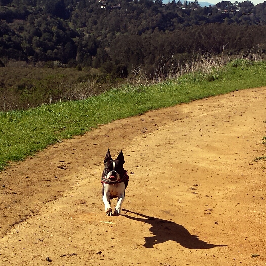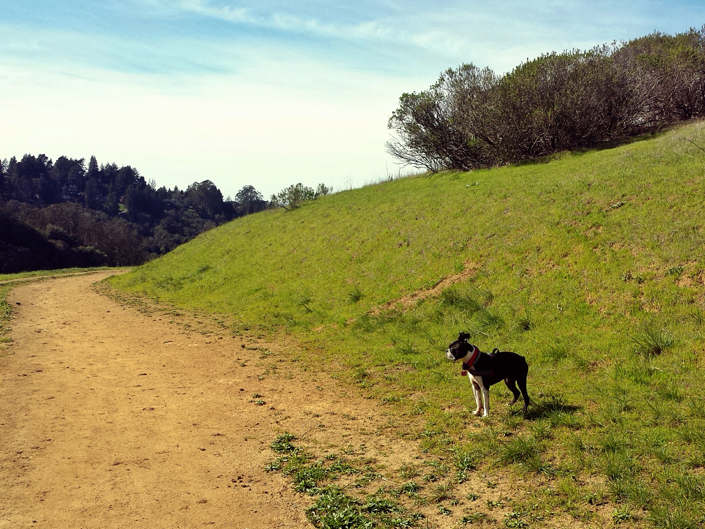 Starting off, no matter which way we go on the loop, we start on Curran Trail and descend down to the first trail Intersection, Meadows Canyon is on the right, a bit further up is Sea View Trail. We usually take Meadows Canyon for the first leg of the loop instead of staying on Curran as it is a fairly smooth and easy descent down to Wildcat Gorge Trail, but is steeper on the way back up:) On this part, I let Chico off leash, as it is a wide fire road type path with no sudden drop offs at the edge of the trail, and plenty of fun things for him to sniff and roll around in!
