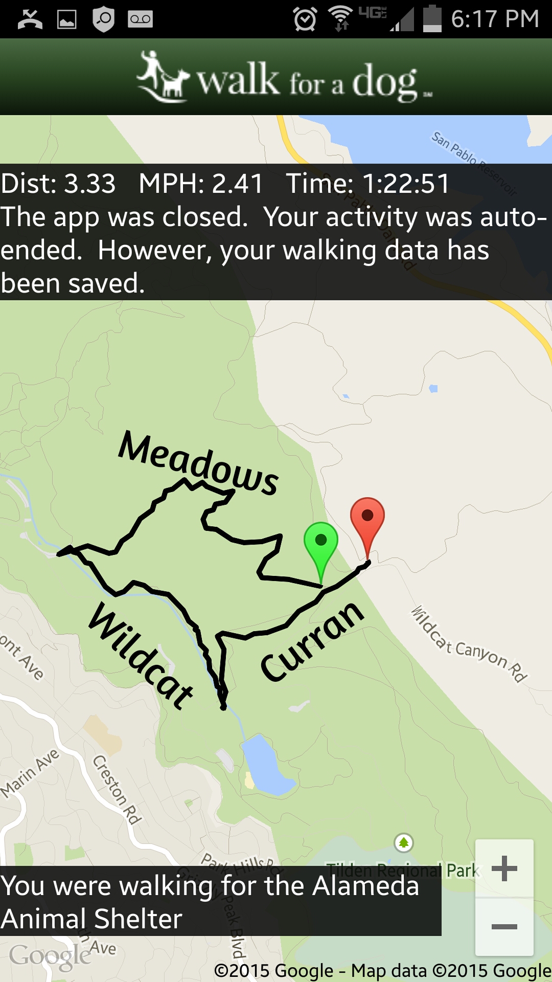 This wonderful 3.5 mile off leash loop can easily be extended in several different spots. It also has water and restroom access, tho you should always bring your own water in case it is shut off. For Chico, depending on length of hike or pack balancing, I use different sizes of Gulpy Water Dispenser for Pet, 20-OunceI only do this loop when it isn’t hot out, as the Meadows Canyon Trail portion is almost all direct Sun Light. Wildcat GorgeTrail is almost all Shade on this portion of the loop, and so is Curran Trail. There can be bike and horse traffic on this loop, but most people ring a bell or give me time to call Chico to heel, if he is not already there. If you don’t know how your dog will react to bikes or horses, best to keep them leashed until you do, and always be looking around. The Image below is a bit short mileage wise because I started the app late.