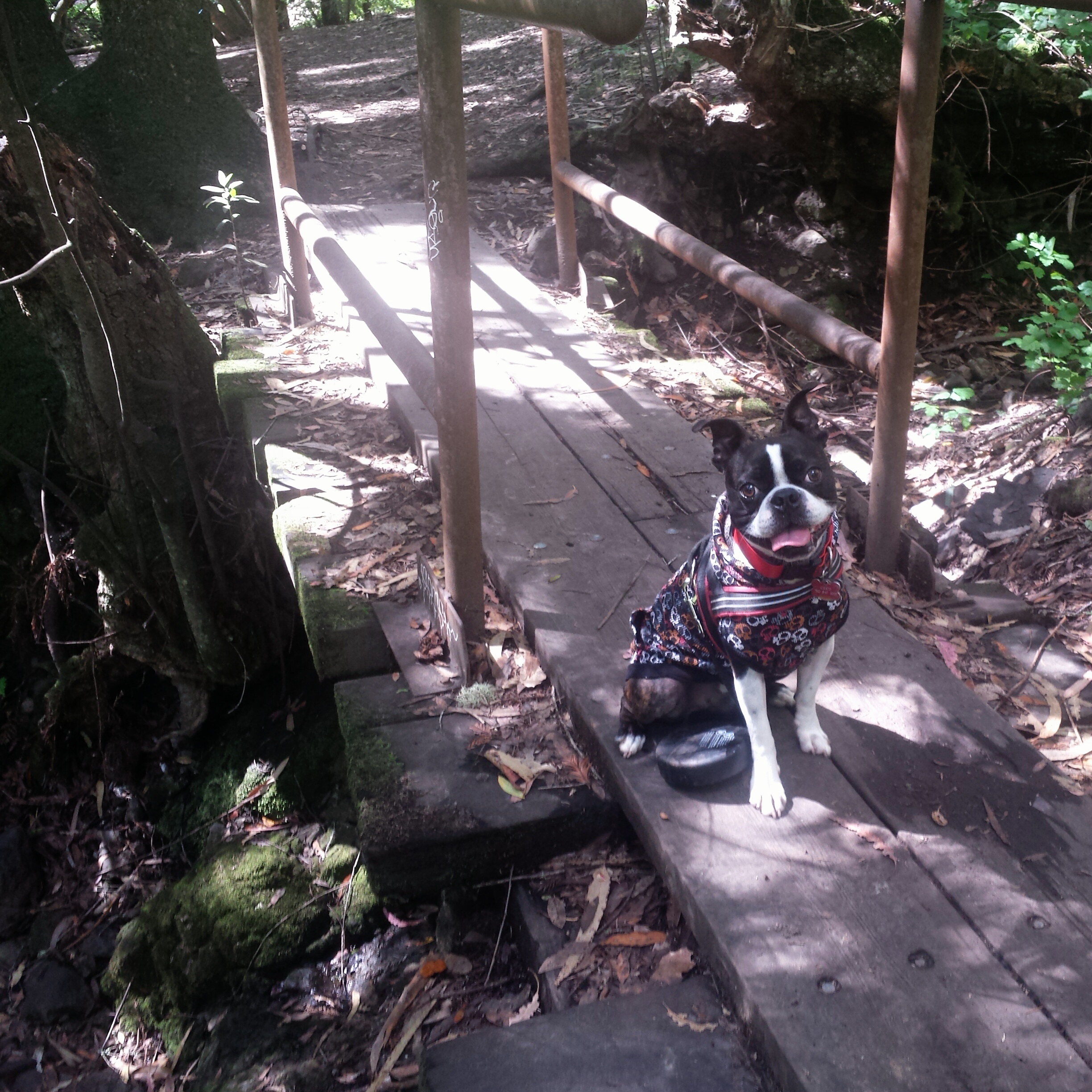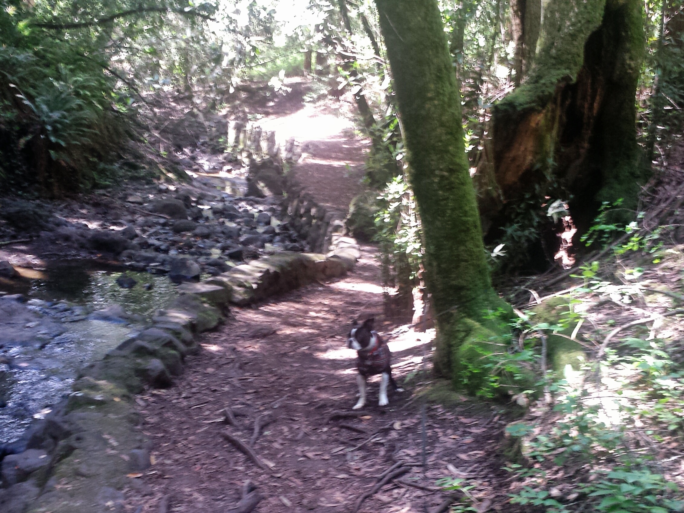After we doubled back, we took the detour, and I have to tell you, the detour seemed 100 times more dangerous than what ever was wrong with the trail by the creek! It was literally a trail of rocks and tree roots on a sharp decent, I had to climb/walk slow down, while Chico just magically flew over them! But he knows “careful” and “Slow” so came back to my side to watch the poor hooman. Sadly this is where my phone died. I tried to get a photo of the detour trail but it isn’t that great. I did get an ok photo of the 3rd bridge that you see from this vantage point.