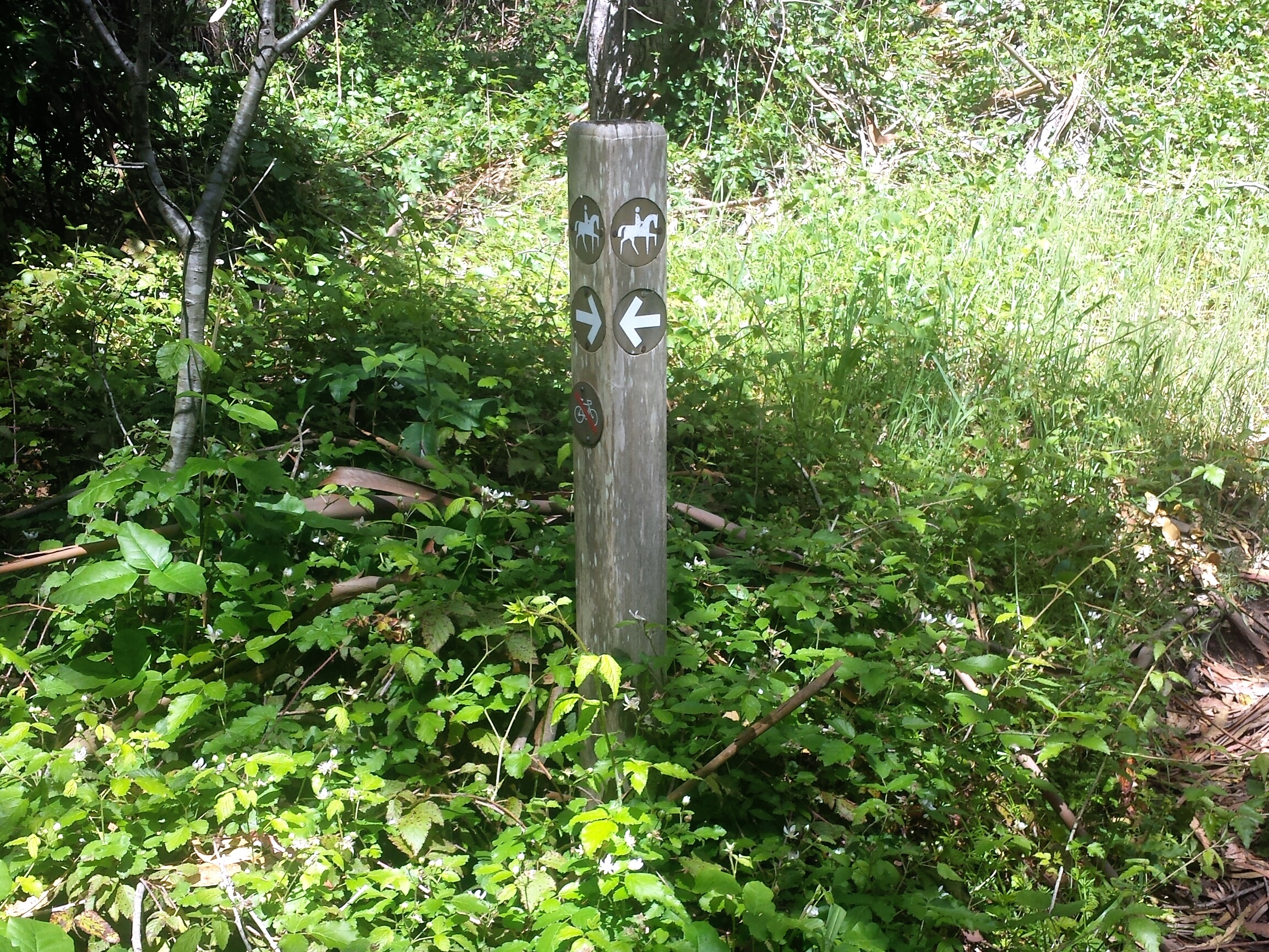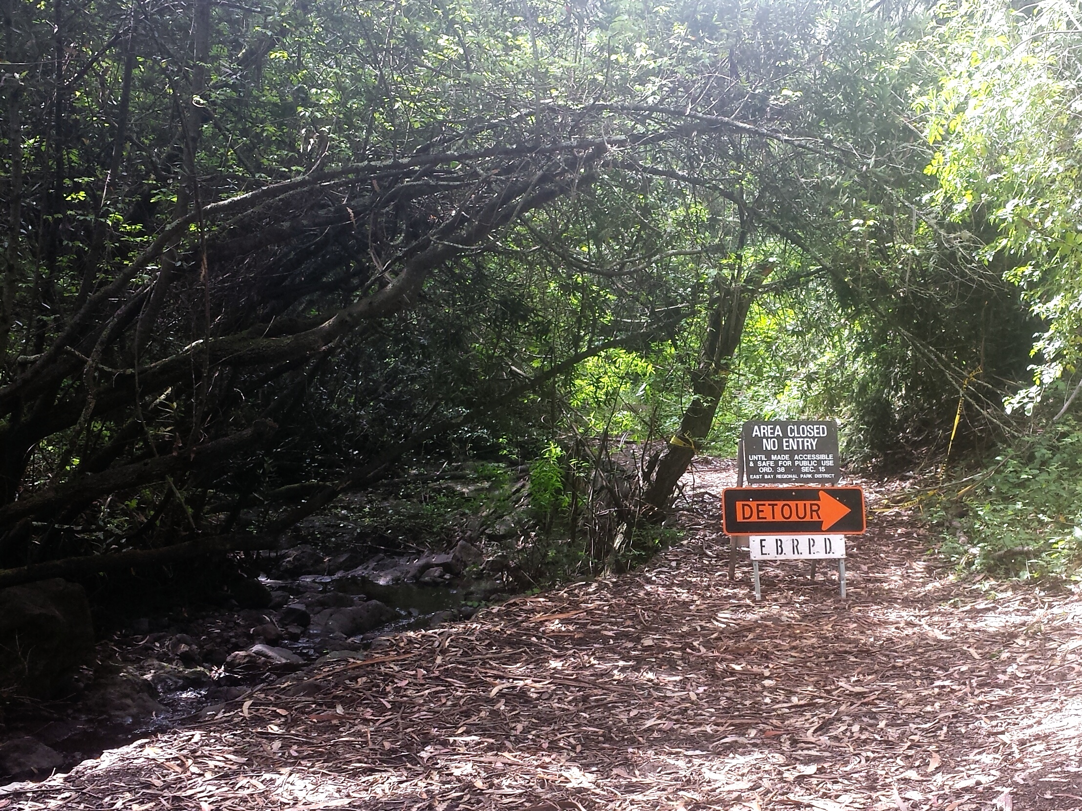 The trail then widens and runs along the creek some more, and you get to a point where there are a few different directions to go all within maybe 50 feet of each other, and there was also a detour sign in the large open area by the creek which I thinks was still the trail we already on. Nothing is actually marked here…except some equestrian trails with no names, and the detour.