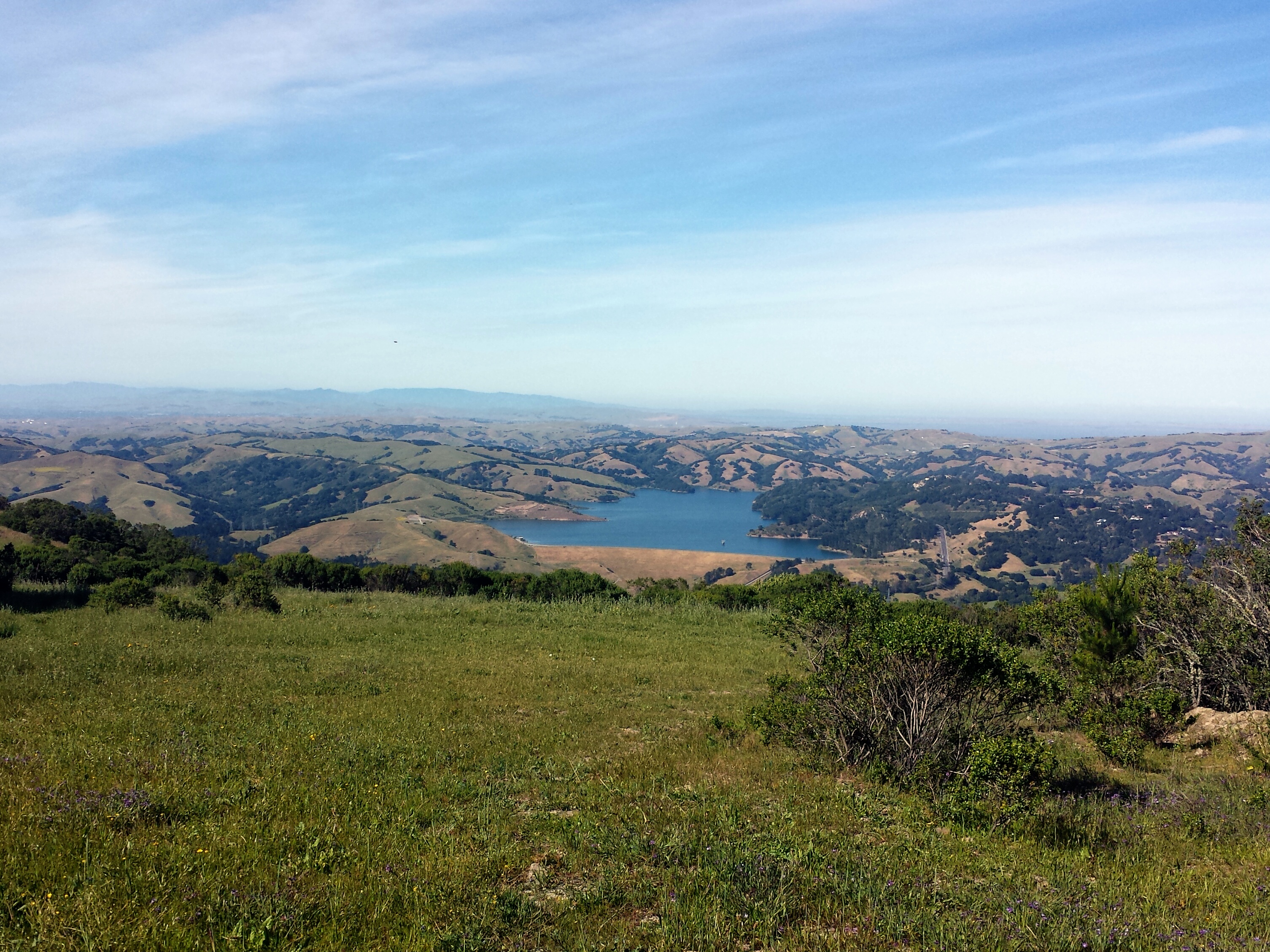 For our loop we turn left, since we visited Vollmer Peak earlier. The paved path opens to a sunny area with more wildflowers, and a path that leads up to a fire road gate with an amazing view of the San Pablo Damn Reservoir.