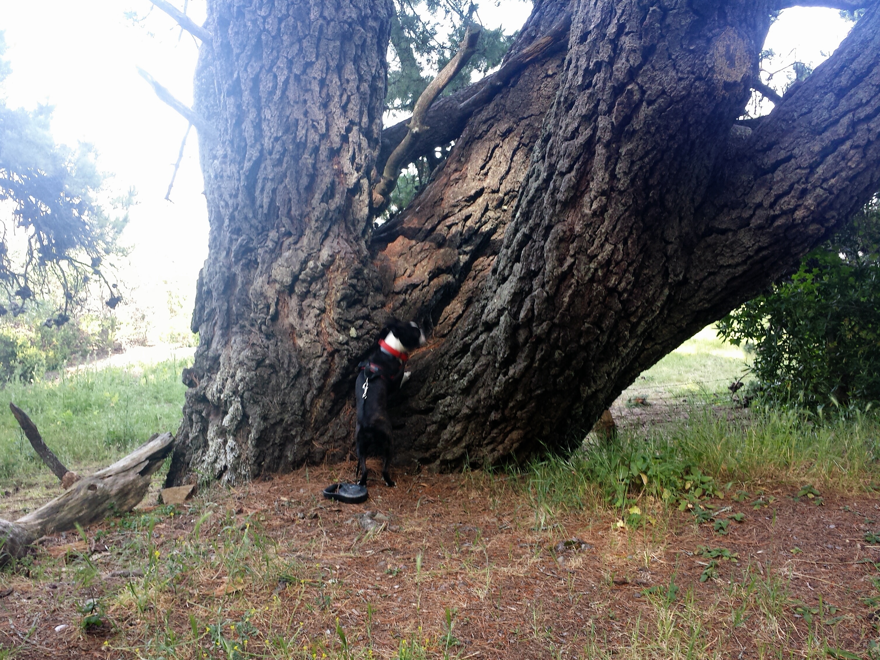 From here you’ll continue your decent down, and see things like pine cone branches, a tree arch perfectly framing the view below, a giant tree trunk, and another view of Mount Diablo.