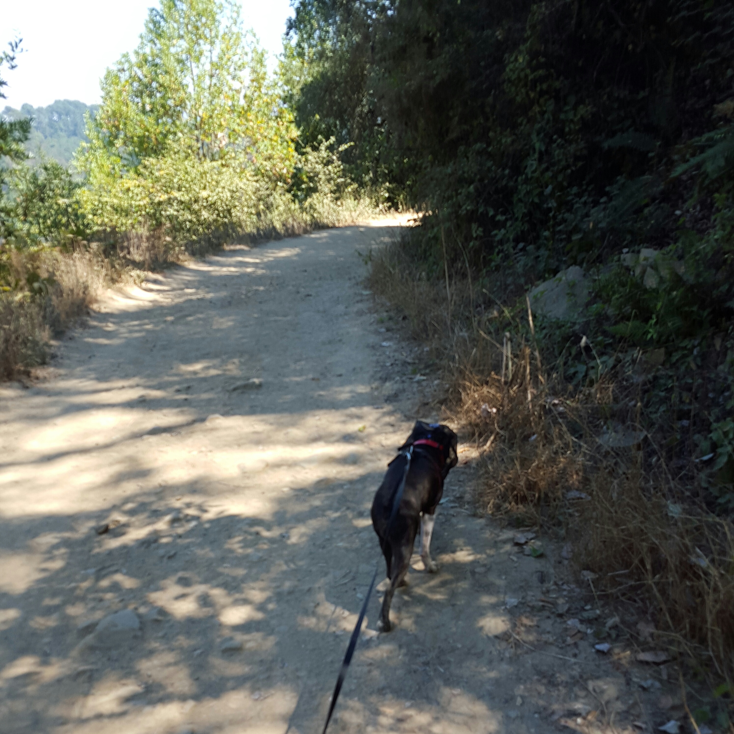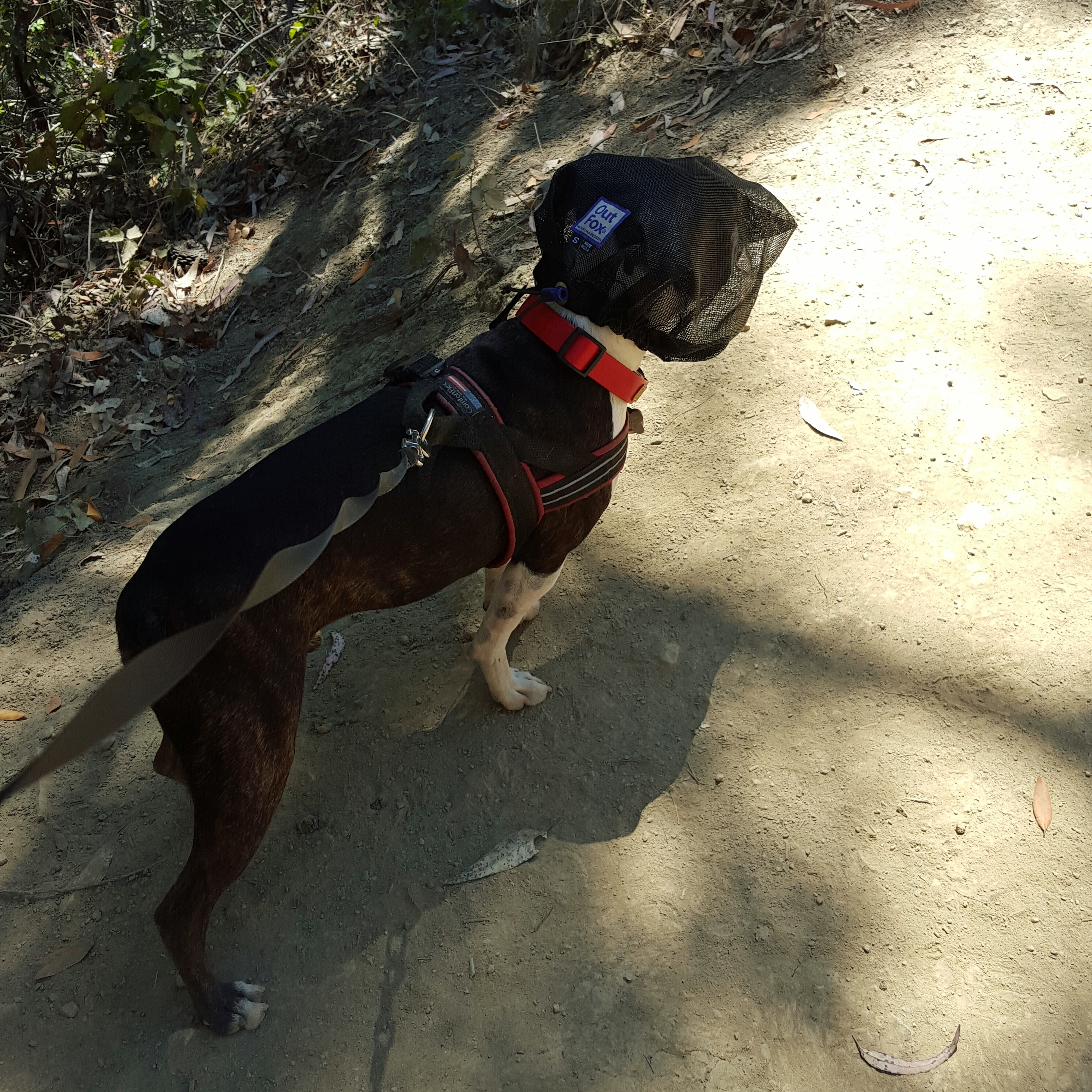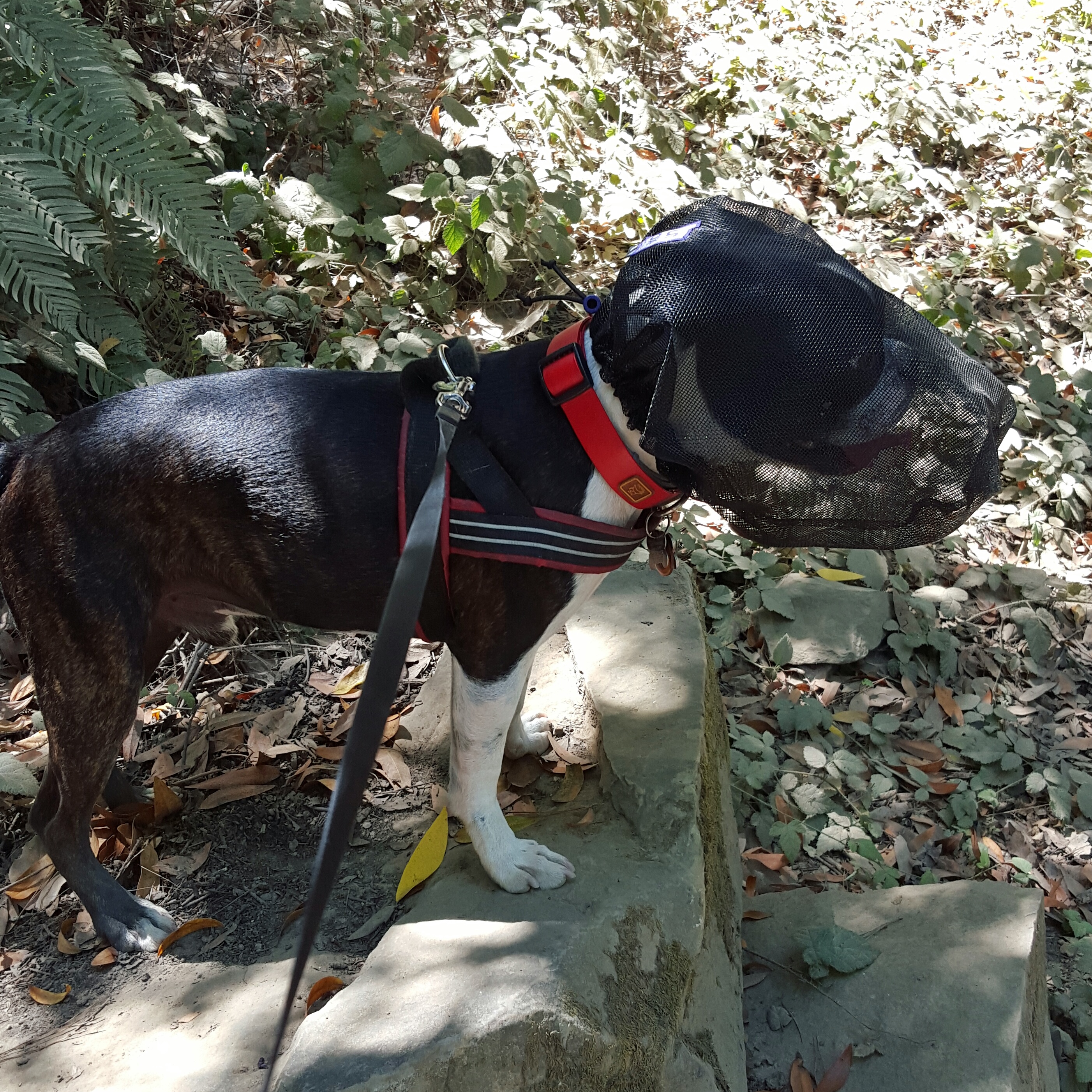 On the trail, Chico acted normal with it, he still sniffed ALL THE THINGS, he never pawed at it. I was able to easily take it off to give him water, though they can also drink water with this on, I was taking it off to check it and him out, so far we have tested it on hot days, and he is able to pant through it just fine, he doesn’t pant more or less with it.