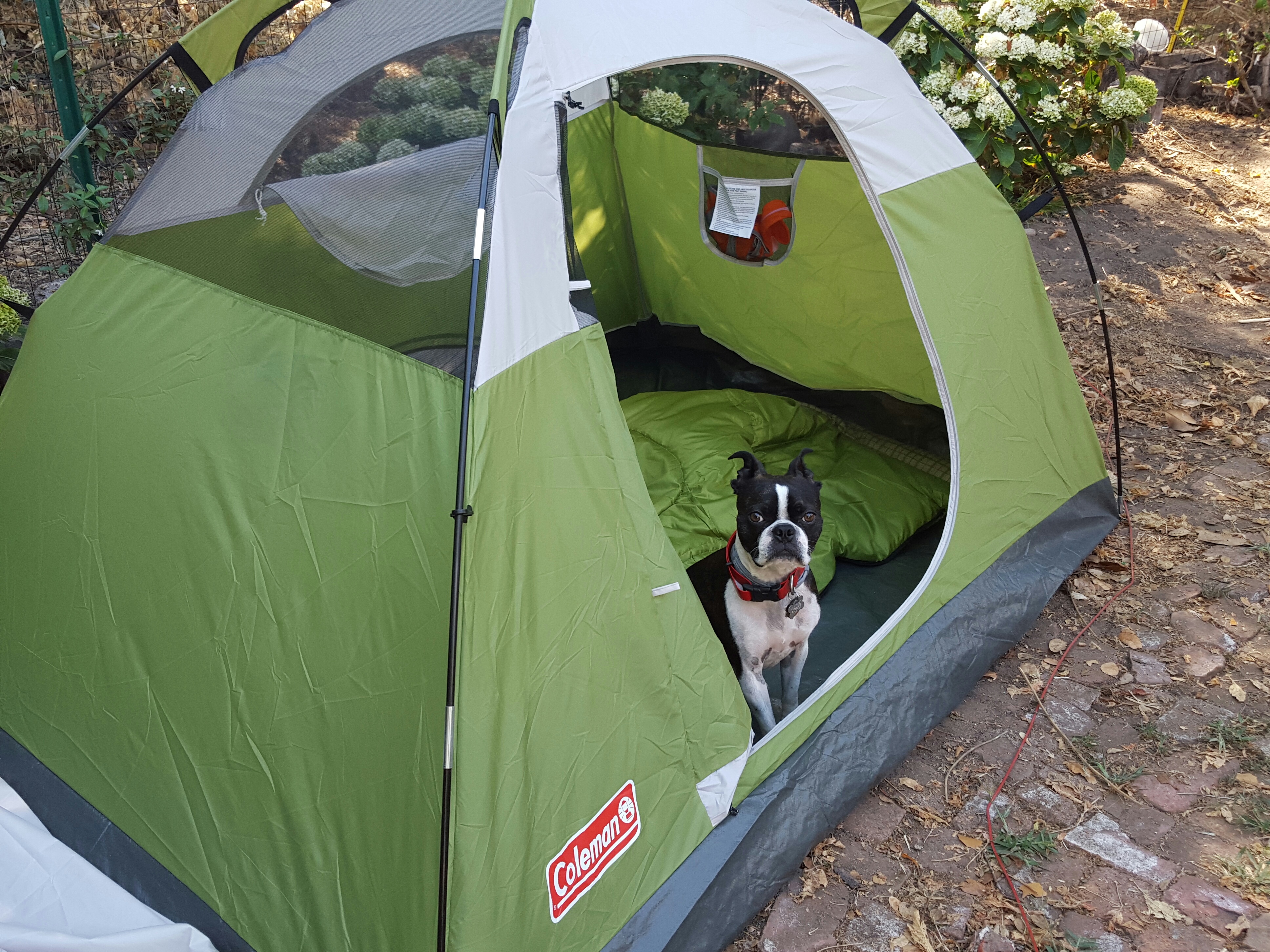 Our Coleman Sundome 2 person tent got here a couple days ago. I wanted to practice setting it up, and sleeping in it since I have to set it up in the dark the first night of our road trip, and Chico, my dog, has never been in a tent before. I actually watched a couple videos on you tube before the tent arrived–warning, most videos on youtube about this tent are copies of other people’s videos, or people just reading the Promo Material for the tent.