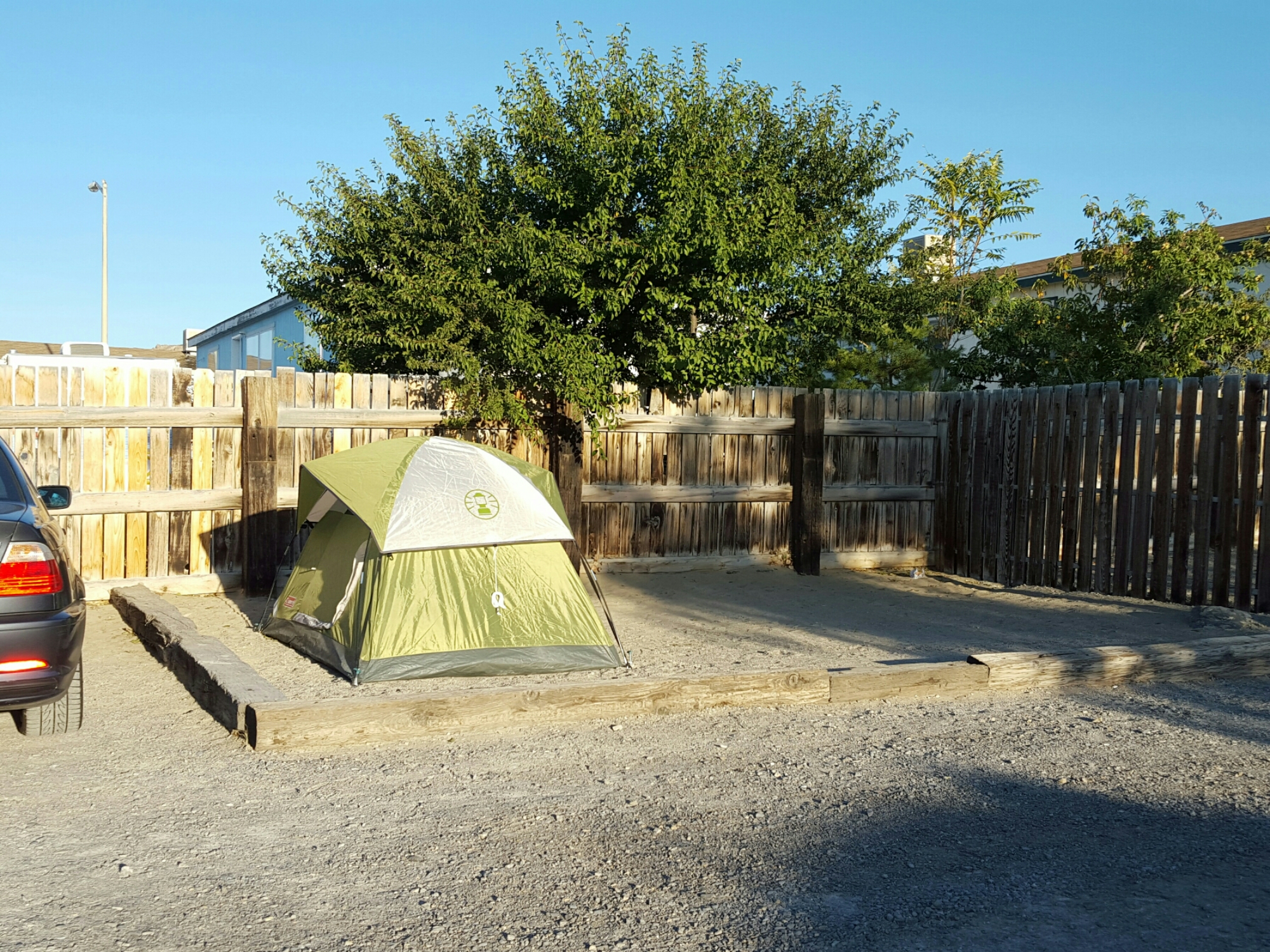 Our first scheduled night of camping was in Wendover, Nevada. This place had the worst reviews of all the places I looked at for our whole trip. Had I arrived during the day, I might not have stayed there as it has a trailer park behind it that looks all Mad Max Post Apocalyptic, and not the Mad Max like our cool friends hanging out at the Thunder Dome Dirt Rave in the desert!