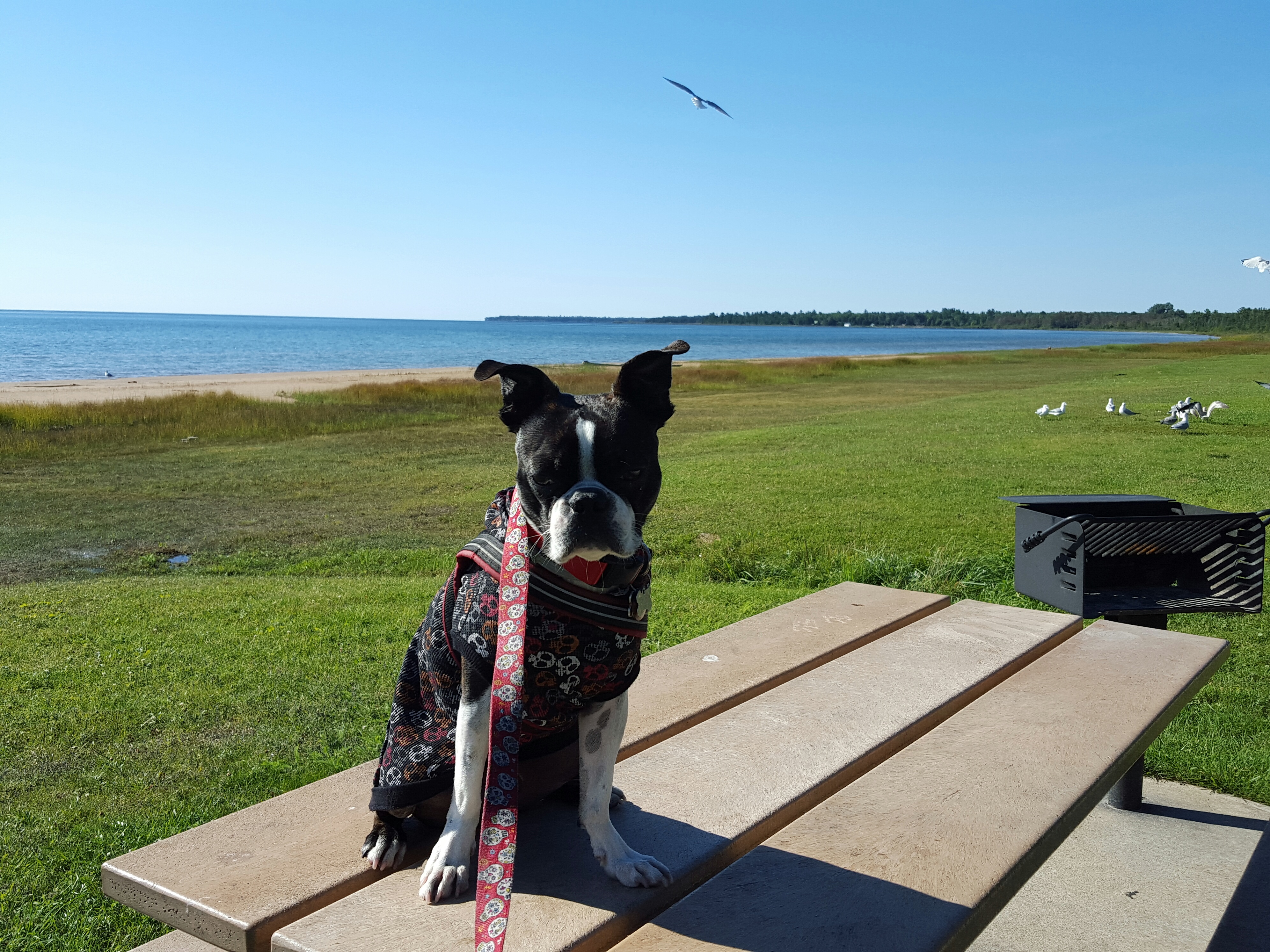 Also, the roadways around Maickaw City, and in the Upper Peninsula along the 2 had what they called “Roadside Parks.” These were parks with a view of the water, plenty of parking, picnic tables, and one room bathrooms that lock–none of them said no dogs allowed, so I brought Chico in with me.